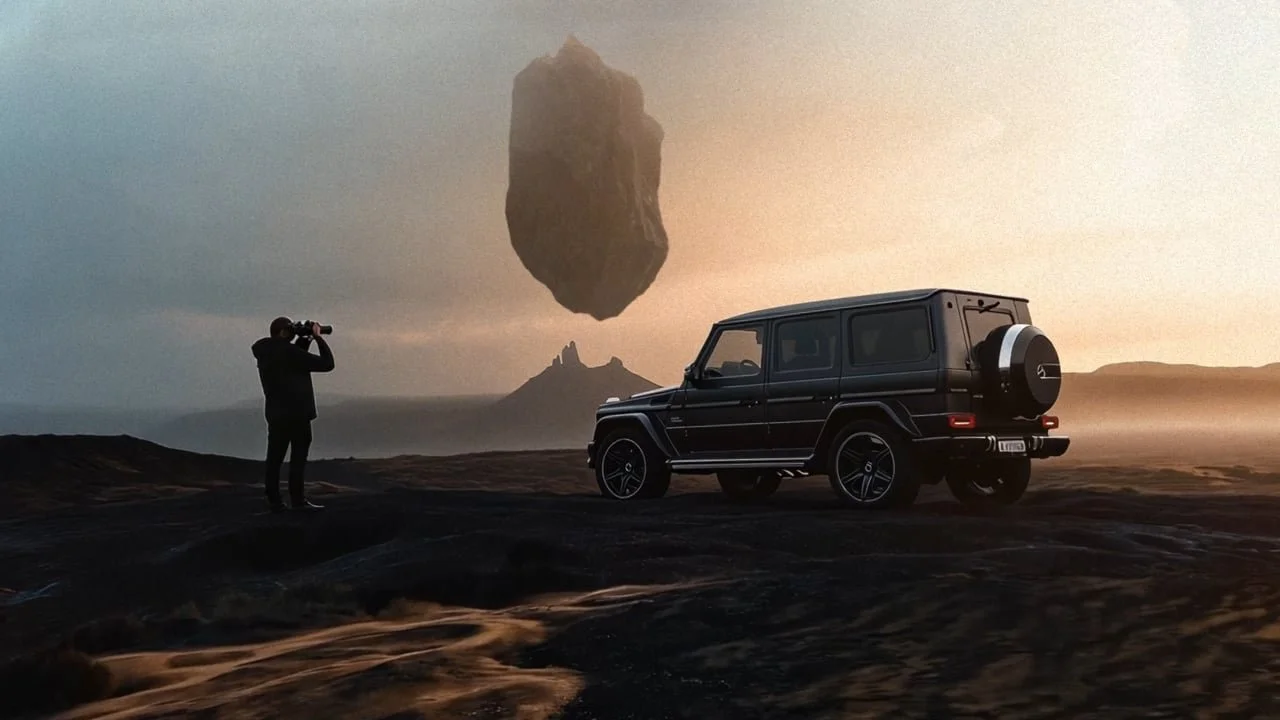 A traveler in a Mercedes G-Wagon crosses a black, carbon-covered volcanic landscape and encounters a strange, otherworldly phenomenon.